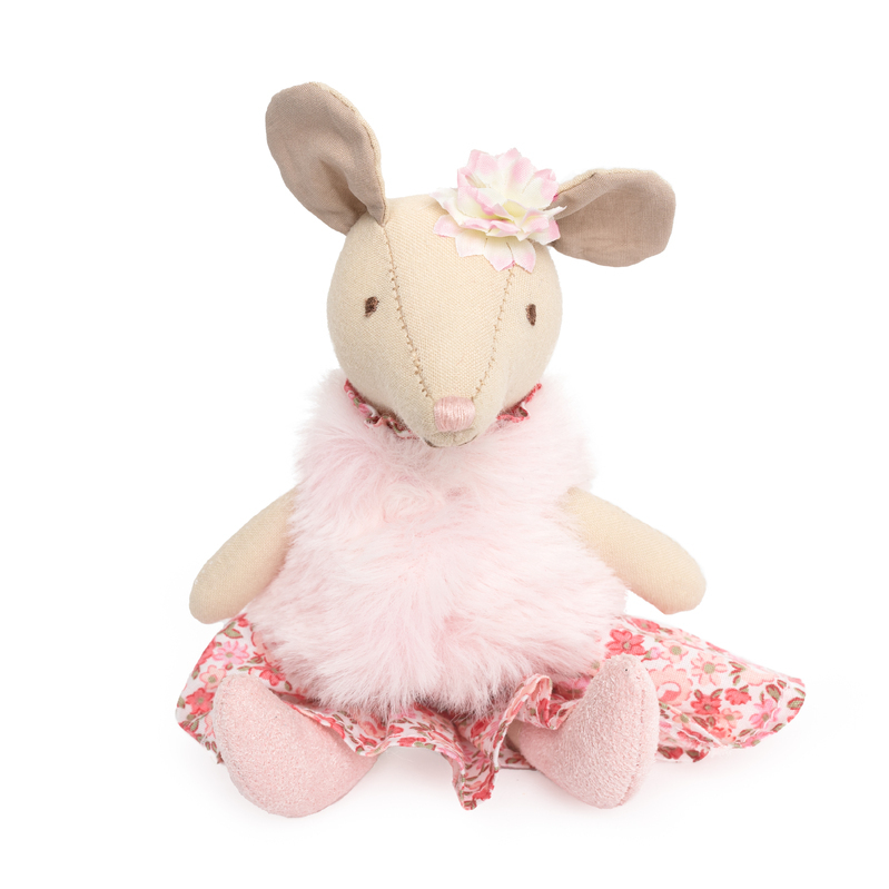 Ariella the Mouse doll has a soft body with an adorable pink fur vest and flower dress.