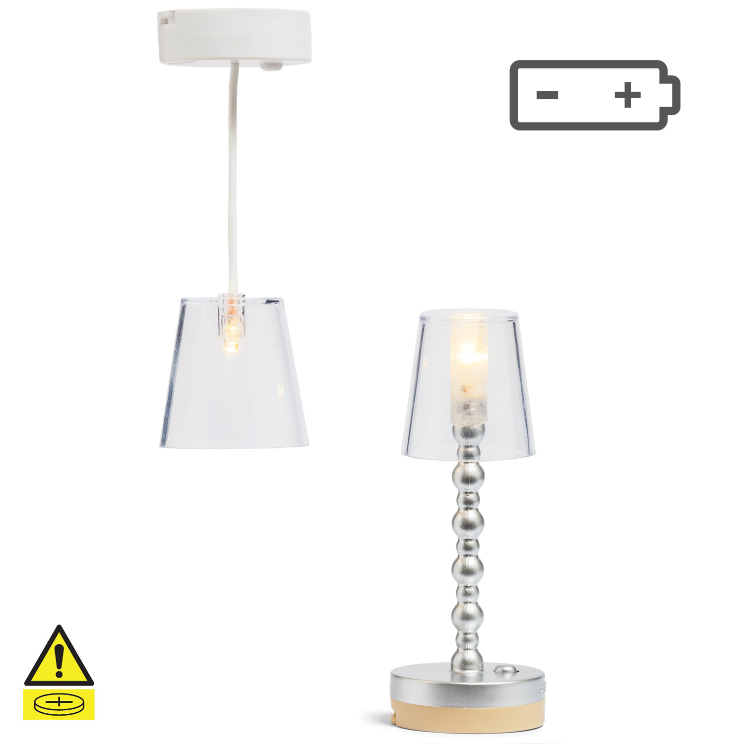 The set comes with battery-operated LED lights that give a warm glow throughout the house. This lamp set includes one ceiling light with a transparent shade and one floor light with silver stand. The ceiling light attachs to the ceiling of the doll's house with Velcro, so it's easy to move.