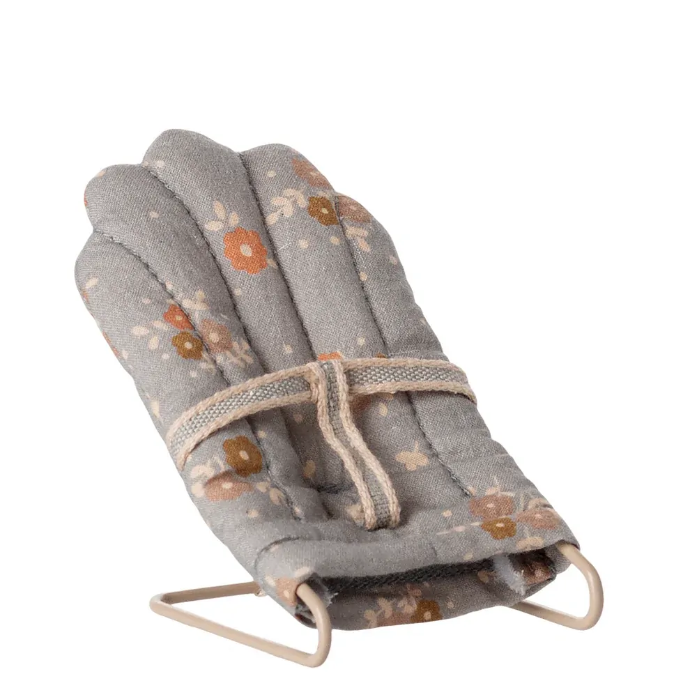 Tuck your tiniest Maileg friends into this charming Babysitter My in Blue. Designed with a petite floral-print fabric in earthy blue tones and secured with a sweet cotton harness, it fits baby mice and My-sized rabbits & bunnies perfectly. The soft quilted seat and sturdy metal frame create a delightful setting for playtime or naptime, making it a must-have accessory in your Maileg world. A beautiful balance of comfort and Nordic nostalgia. Measures H8cm x W6cm.