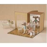 Step into a world of tiny pirouettes and grand jetés with the Maileg Ballet Mice Dance Studio featuring Little Sister and Brother. This beautifully designed fold-out studio comes with one side as a charming mirrored practice room with a ballet barre and the other side with soft floral bedding for post-performance rest. The included ballerina mice are dressed in delightful dance outfits, ready to twirl and pose their way through imaginative routines.
