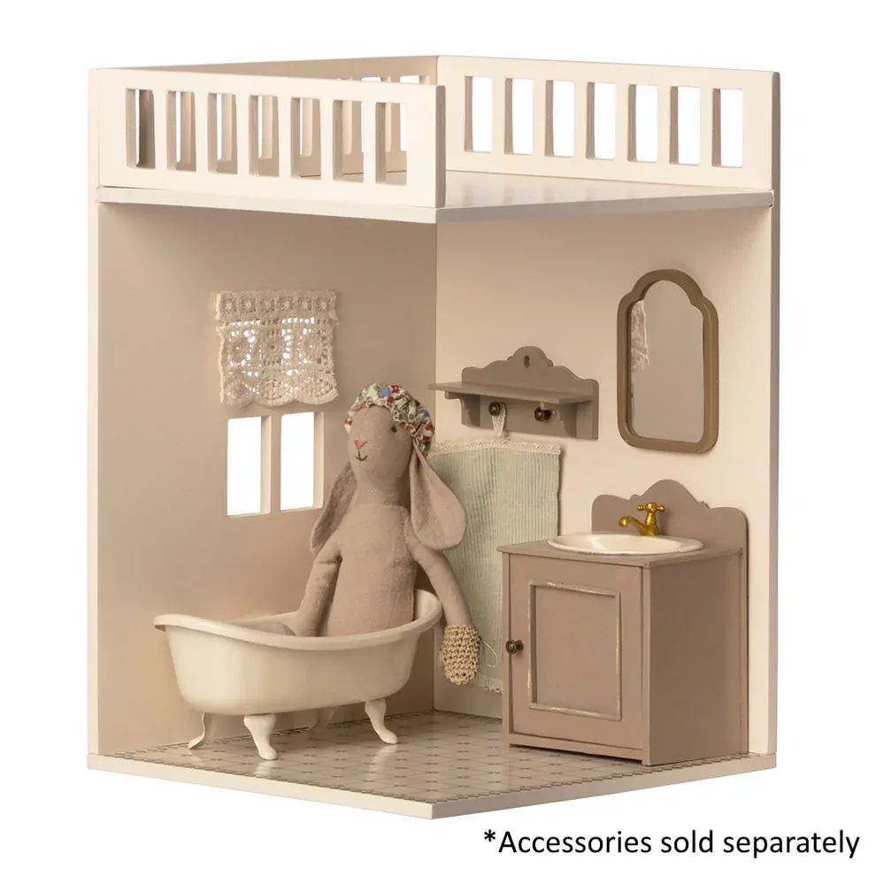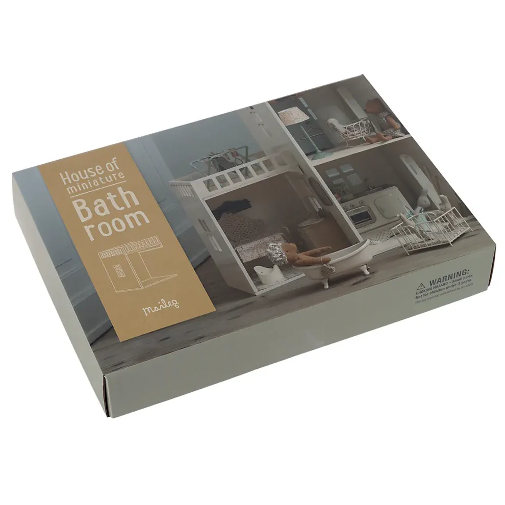 The Maileg Miniature Bathroom comes with a nicely decorated floor and small curtains to keep your Maileg friends private. Purchase the bathroom accessories separately to complete the look. Measures H30cm x W26cm x D27cm.