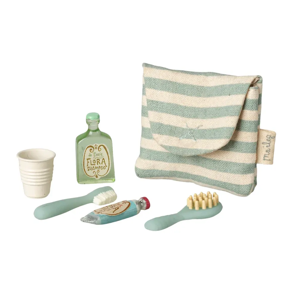 The Maileg Toothbrush Set Mouse Blue brings everyday routines to life in Mouse homes. Neatly stored in a soft blue striped fabric pouch, this miniature set includes charming bathroom accessories designed to encourage imaginative play and storytelling. The calm blue palette pairs effortlessly with Maileg furniture and accessories, helping create cosy spaces that feel lived-in and full of character. Bag measures H5cm x W4cm.