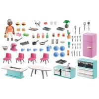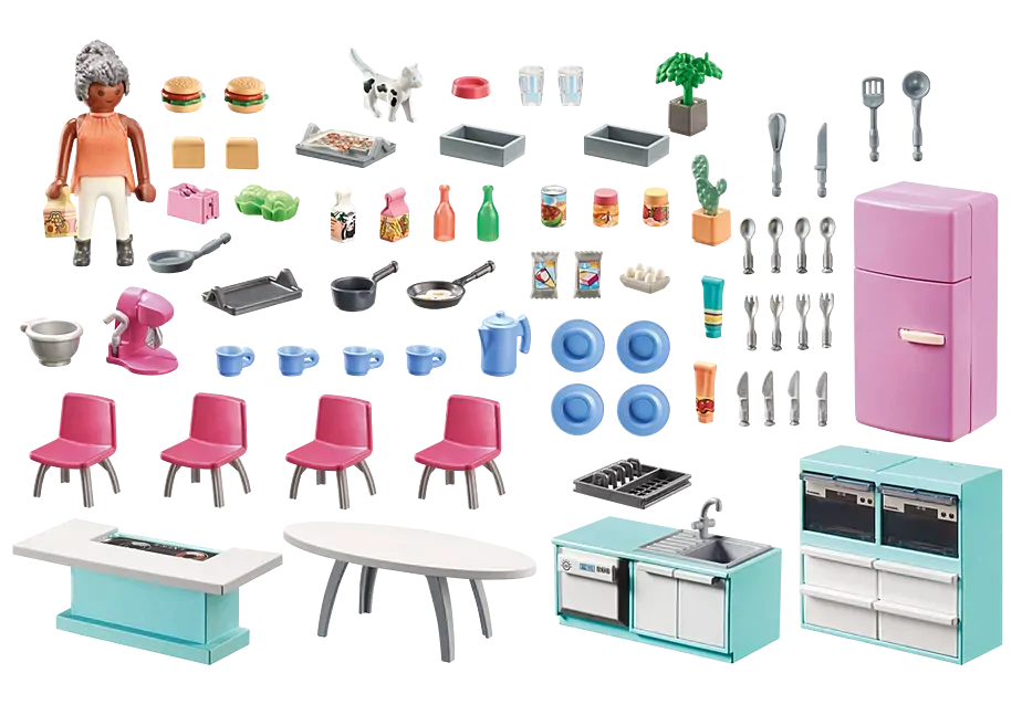 Includes - Figures: 1x woman Animals: 1x cat standing Accessories: 1x table, 4x chairs, 1x fridge, 1x kitchen island with ceramic hob, 1x kitchen unit with 2 ovens and storage space, 1x kitchen unit with sink, dishwasher and storage space, 1x crockery set, 1x cutlery set, 2x baking tray, 1x food processor, 1x toaster, 2x hamburgers, various green plants in pots and food, 1x food bowl