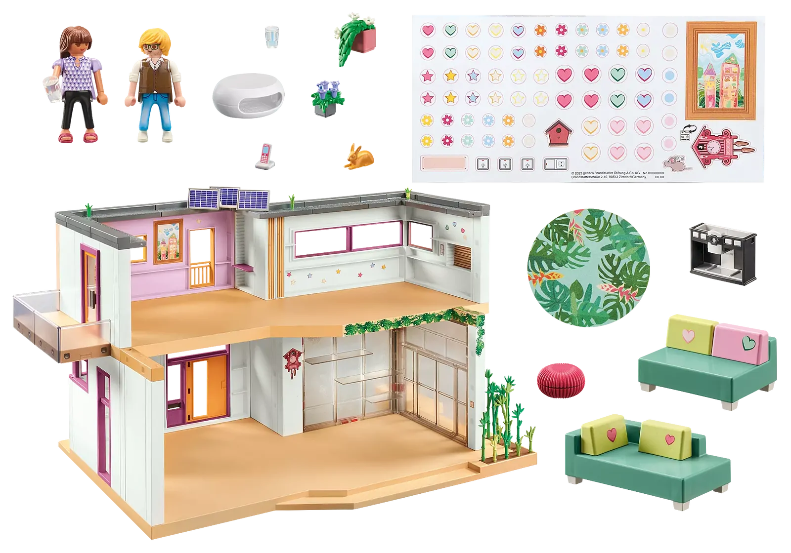 Set includes 1x man, 1x woman, 1x Bauhaus-style house with 3 rooms, conservatory and balcony, 1x modular sofa, 4x cushions, 1 pouf, 1x coffee table, 1x cell phone, 1x carpet, 1x fully automatic coffee machine with 2 latte macchiato glasses, 1x vine with grapes and various green plants, 3x solar panels