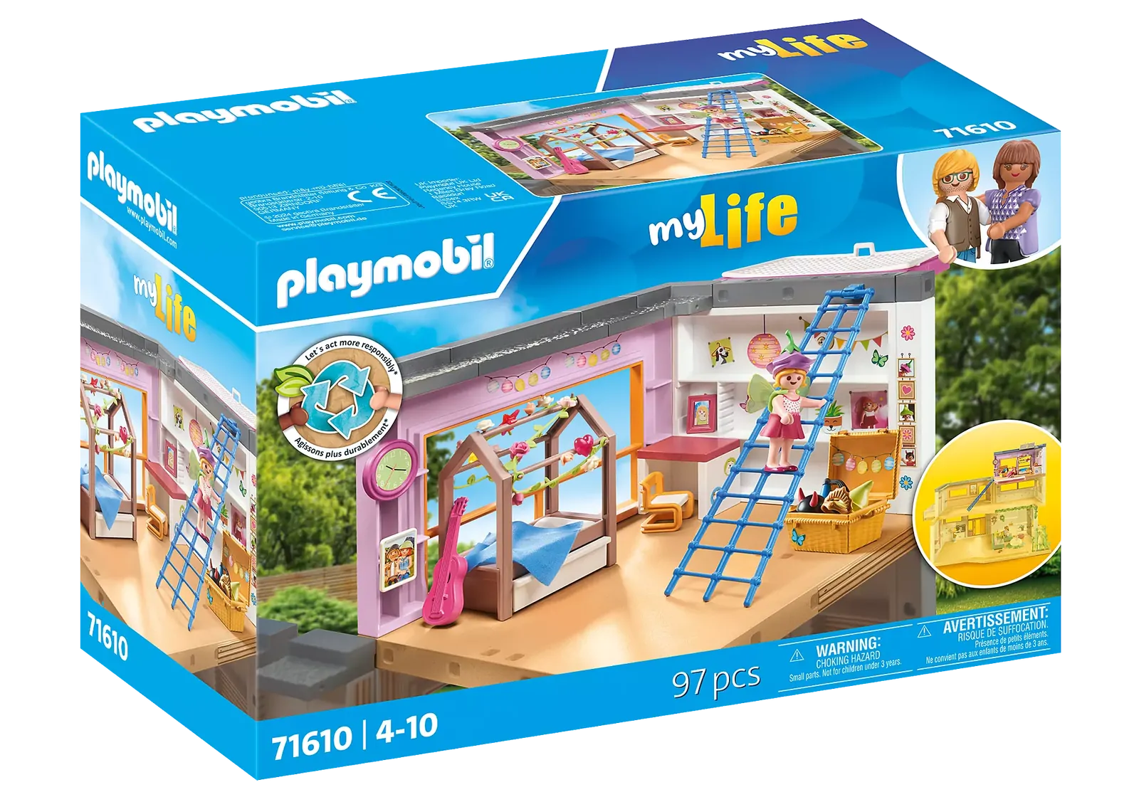 Fun, play, and laughter are the order of the day in the cheerful PLAYMOBIL children's room. Detailed children's room extension made from sustainable materials, featuring one PLAYMOBIL figure and many fantastic extras.