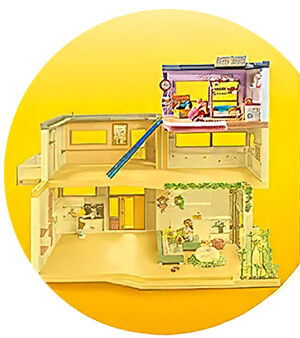 Set includes 1x girl, 1x base plate with two walls as an extension/addition to the new house, 1x crib with flower garland and drawer, 1x blanket, 1x desk with chair, 1x treasure chest with disguise items, 1x ladder with hanging net for relaxing, 1x guitar