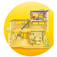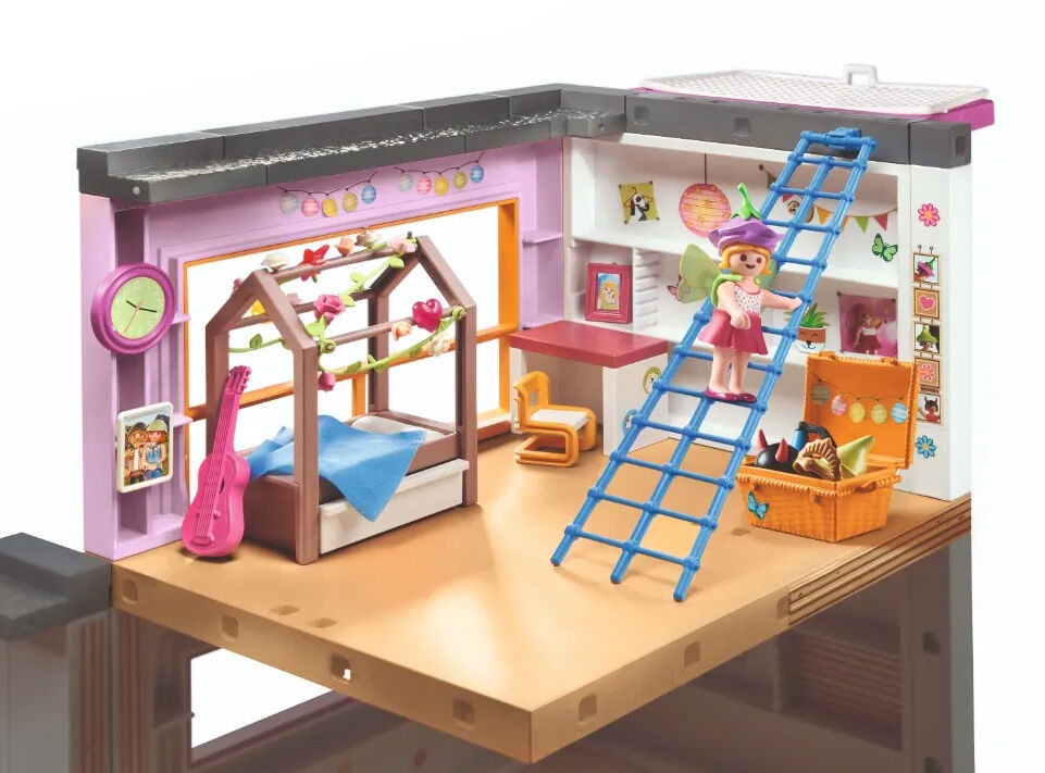 The lovingly equipped children's room is the perfect retreat for youngsters. Here, you'll find a bed with a garland, a dress-up box, a chill-out net that can also be installed in other parts of the house, and a ladder to reach the net. With removable stickers, the room can be decorated to taste. For the individual expansion of the new Living House with Winter Garden (71607). Perfectly combinable with other Living House sets from PLAYMOBIL.