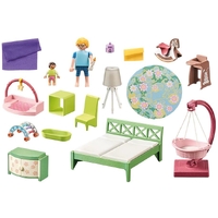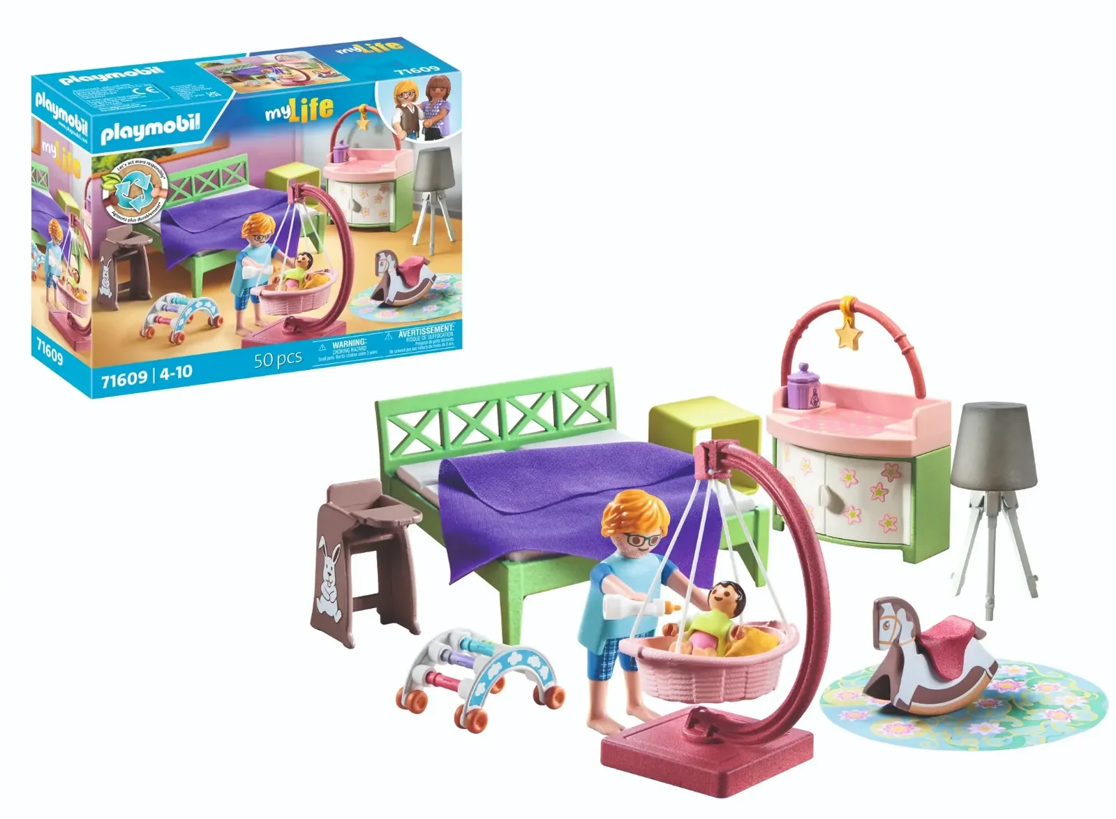 Modern PLAYMOBIL bedroom with baby play area for enjoyable role-playing in the cozy home. Sustainable material playset featuring two PLAYMOBIL figures, a bed, changing table, and many lovely extras.