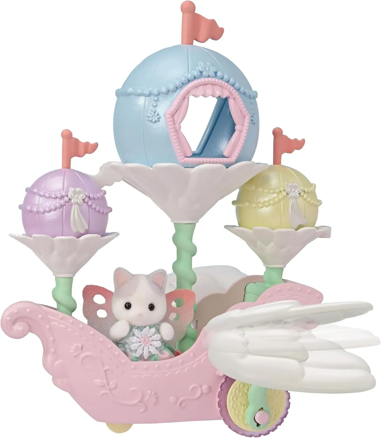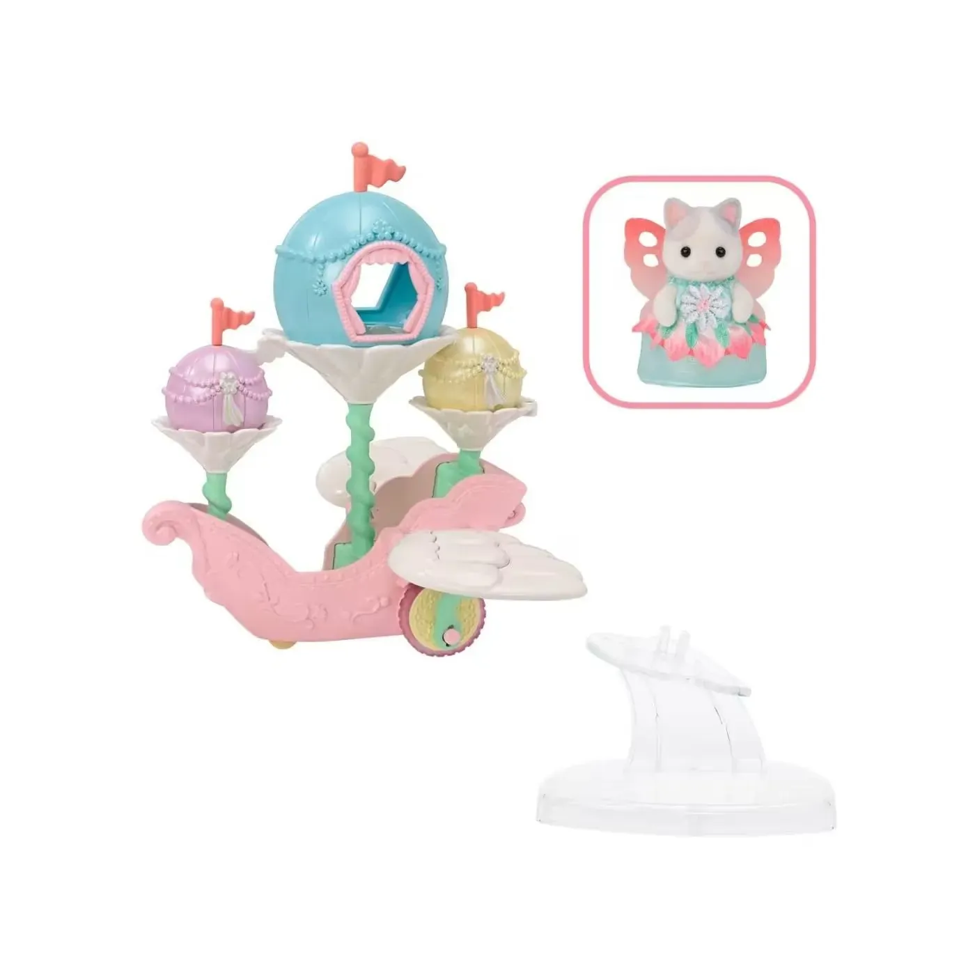 A fun set containing a skyship with lots of fun features and the Latte Cat baby in a cute fairy costume. The wings of the skyship flap up and down as it moves. Child and baby figures can sit in the skyship. The skyship can be placed on its stand and used as an ornament. It looks like it's really flying!